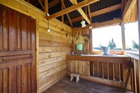 В доме: 2 отдельные кровати + двухъярусная, стол, стулья, печь, тумбочка, чайник, плита, микроволновка, холодильник. Закрытая веранда с умывальником.