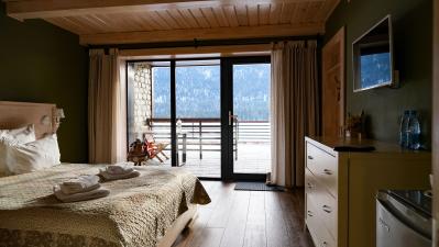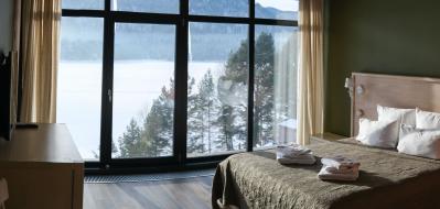 Номер категории "Стандарт" (2 осн.+доп.место) Просторный однокомнатный номер с панорамным окном с видом на Телецкое озеро. В номере: двухспальная кровать, туалетная комната с душем, ТВ, холодильник, мебель.