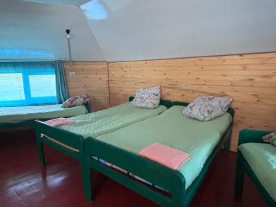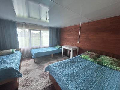 3 кровати (1-двуспальная, 2- односпальные кровати), электроплитка, холодильник, чайники, посуда, стол и стулья.