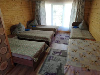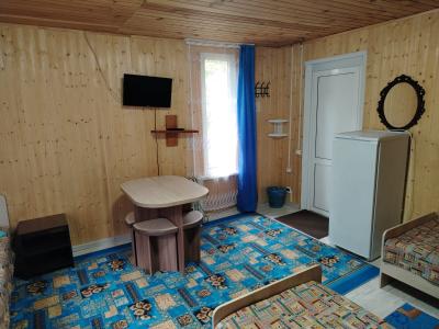 четыре раздельных кровати, теплый пол, обогреватель, ТВ, холодильник, чайник.