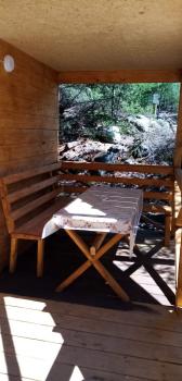 санузел (душ, туалет), раскладной диван, кухня, микроволновка, холодильник, чайник, ТВ, обогреватель, панорамное окно на лес.