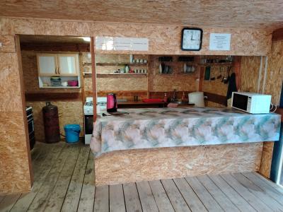 Застекленная столовая-кухня на 20 чел. площадью 100 м2 (2 газовых печи с духовкой, микроволновка, чайник, посуда, горячая и холодная вода).