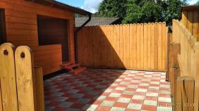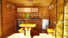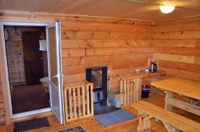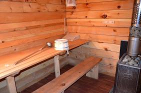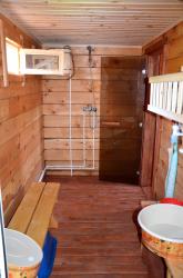 - Кедровая баня с тремя отделениями: парная, моечное, комната для отдыха. Внутри парная отделана вагонкой из липы. Каменка выложена из лечебных камней. Есть парогенератор, который выдает полезный мелкодисперстный пар.