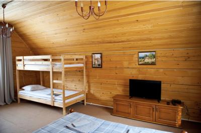 2 этаж: 2-спальная кровать, двухъярусная кровать, 2 тумбочки, 2 тумбы, ТВ тумба, телевизор.