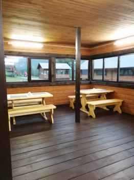 Большая беседка 60 м2 для йоги, для семинаров, тренингов. Аренда помещений бесплатно при проживании на базе. Отдельно оплачиваются еда и напитки.