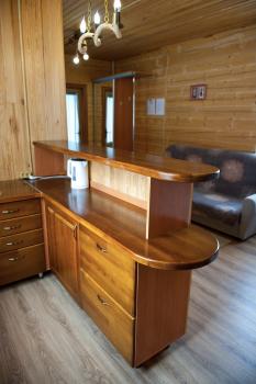1 этаж гостиная: прихожая-шкаф, диван (2 спальных места), стол + 4 табурета, кухонная зона, выполнена в виде барной стойки, холодильник, плита, чайник, посуда.