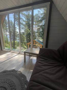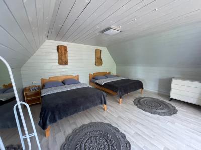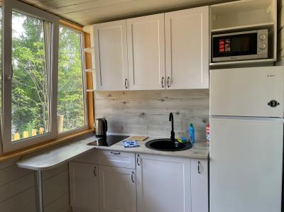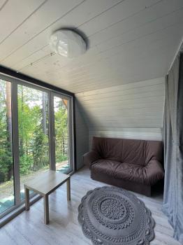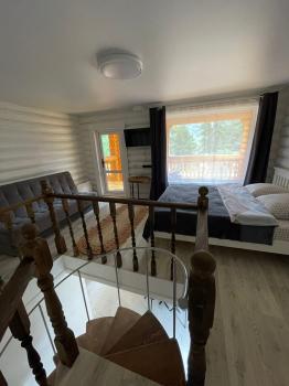 Каждый номер имеет 2 этажа. На первом этаже кухонная зона (плита, холодильник, микроволновка, чайник, посуда, вода) и сан.узел с душевым уголком (фен, бытовая химия), на втором этаже двухспальная кровать и диван, балкон (полотенца, постельное белье). На первом этаже софа, как дополнительное место