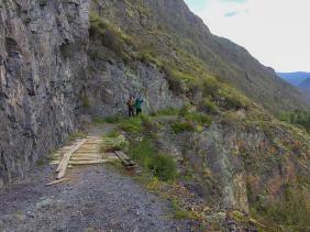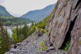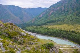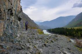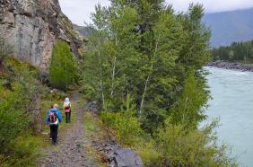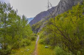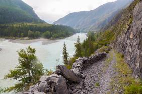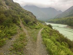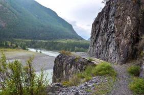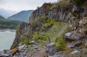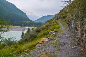 Здесь оставляете машину и дальше вниз, ближе к Катуни. Тропа то становится шире и идет по склону горы, то прижимается к скалам. Подъемы чередуются со спусками. Прогулка, конечно, с нагрузкой, но виды на Катунь, на горы, возможность подышать свежим воздухом дают массу наслаждения!