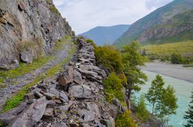 После войны Катунскую тропу, по которой перегоняли скот из Монголии пробовали сделать дорогой, пригодной для машин. Здесь работали заключенные. Дорогу не приняли, она была признана слишком экстремальной, главного инженера расстреляли... От строительства тех лет остались каменные кладки, укрепляющие дорогу и каменные парапеты.