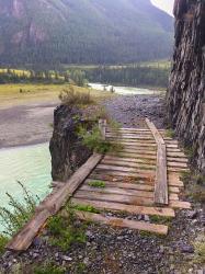 Дорога основательно заросла, осыпалась, засыпалась камнями. В 2006 г. клуб экстремальных автопутешествий OFF ROAD MASTER в составе 5 машин сделал первопроход по Катунской тропе! Команда клуба расчистила путь от больших камней, а рядом со слиянием Аргута и Катуни был сделан настил, крепящийся на рельсе, так как ширина дороги в этом месте была чуть больше метра. Этот легендарный мост вы сможете увидеть!