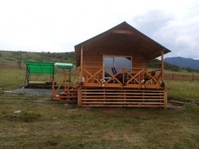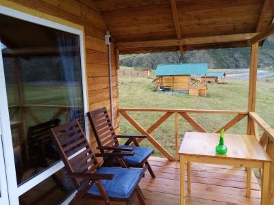 Санузел с душем и унитазом, на веранде два деревянных кресла, рядом с домиком качели.