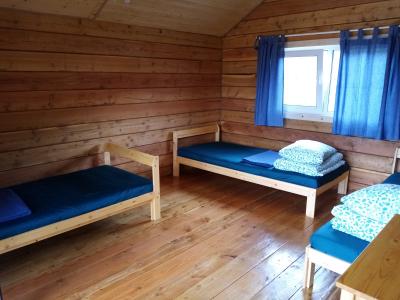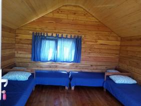 Домик 4, до 4х-мест (дом из лиственного полубруса с панорамным окном): печка, инфракрасный обогреватель, одна двуспальная кровать и 2 односпальные кровати, стол, стулья, этажерка, чайник электрический, мини-холодильник.