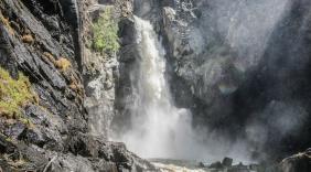 Водопад Дол-Оозы. Название переводится "в начале пути, в начале тропы". Виден с территории турбазы, находится в начале серпантина Кату-Ярык. Можно добраться на лошадях.