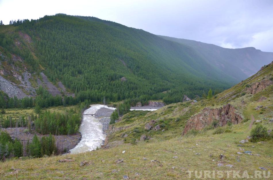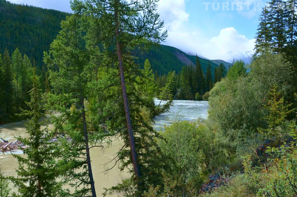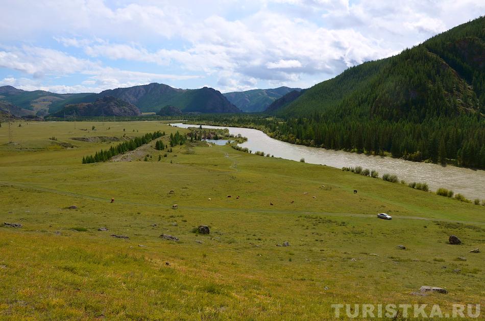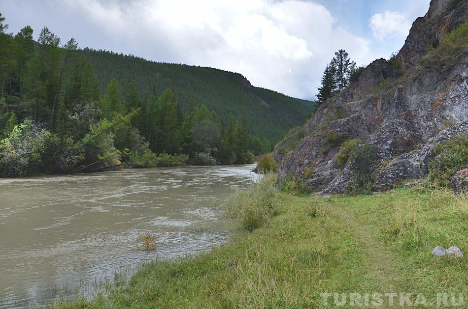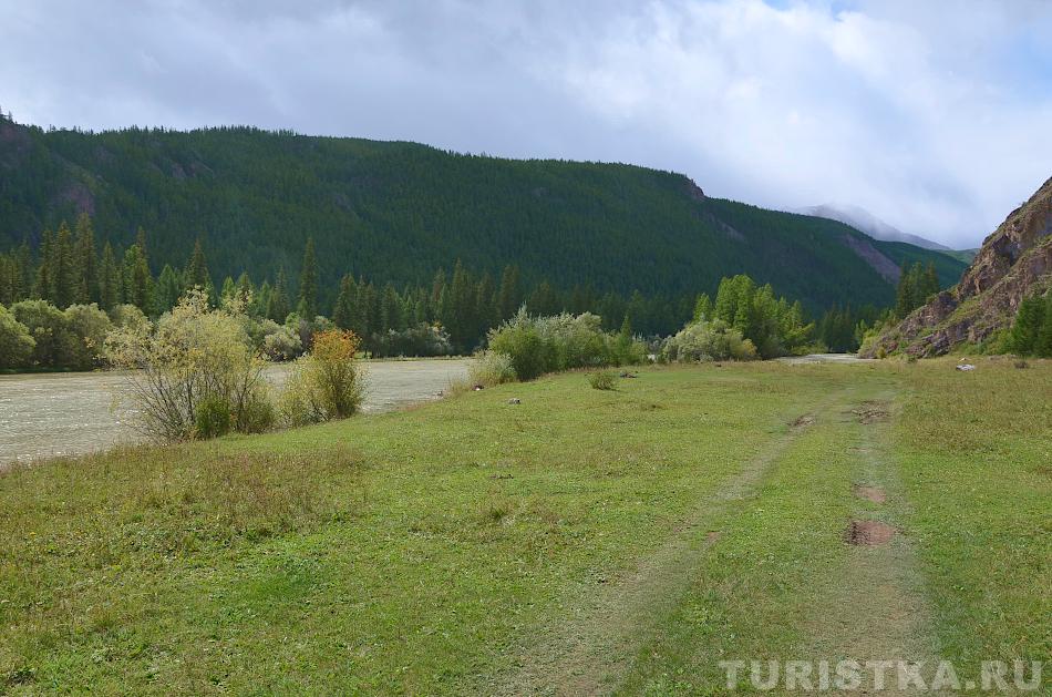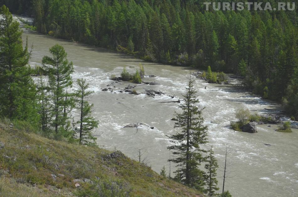 До слияния Чуя течет достаточно широко, разливаясь между пологими берегами. До первого скального прижима есть грунтовая дорога, по которой, видимо, ездят местные жители на покосы. До этого места возможно проехать на внедорожнике. Машину надо оставить или здесь или раньше в районе базы "Мажой".