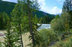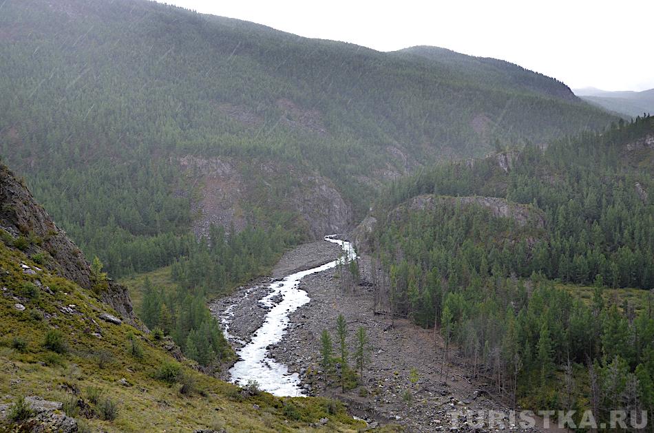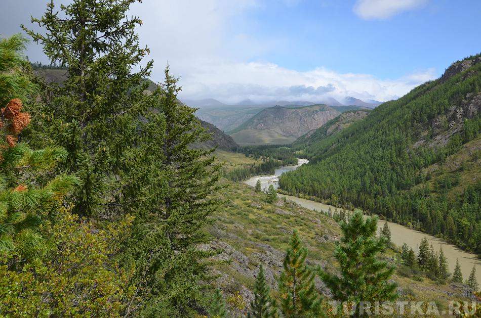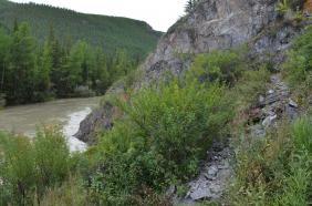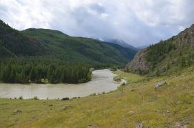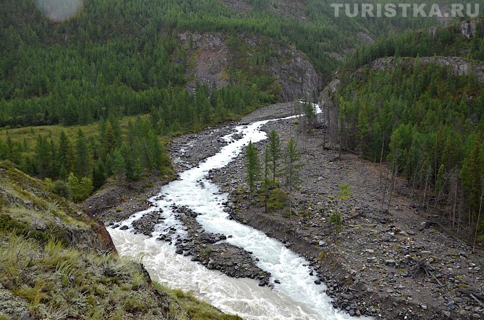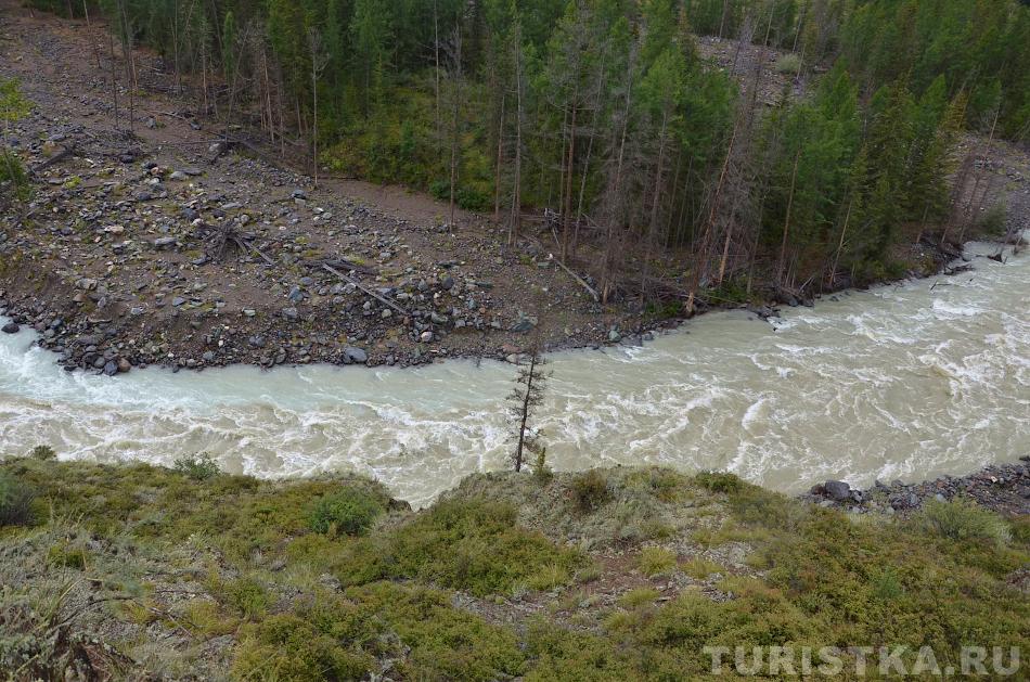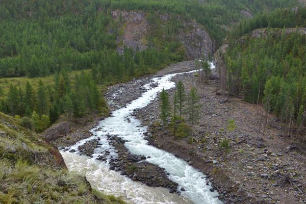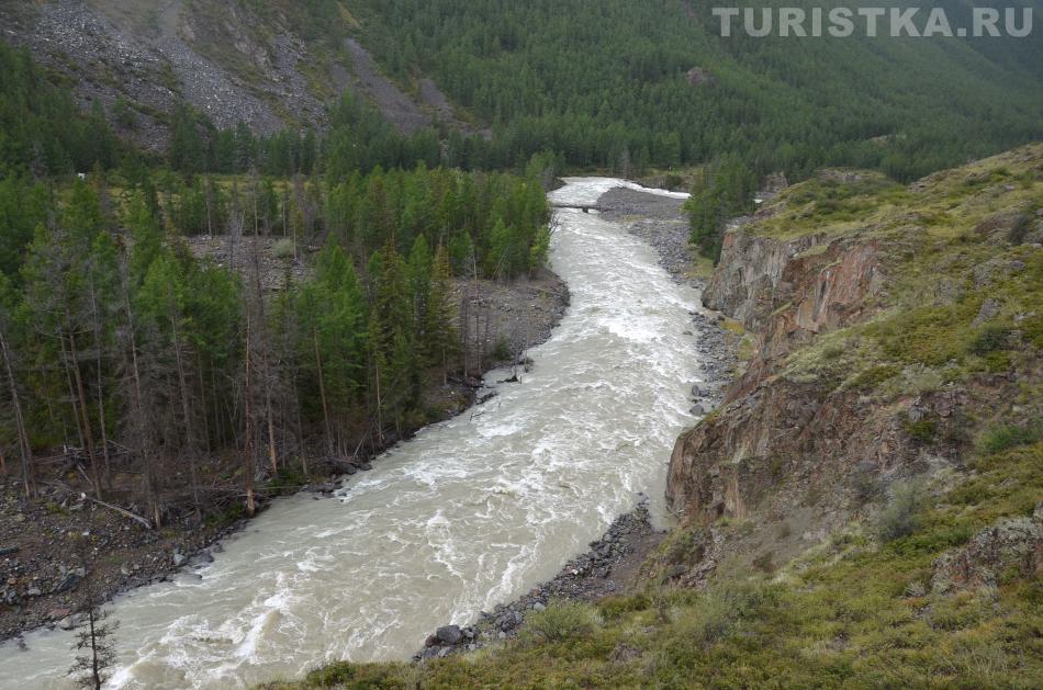 До слияния Чуя течет достаточно широко, разливаясь между пологими берегами. До первого скального прижима есть грунтовая дорога, по которой, видимо, ездят местные жители на покосы. До этого места возможно проехать на внедорожнике. Машину надо оставить или здесь или раньше в районе базы "Мажой".