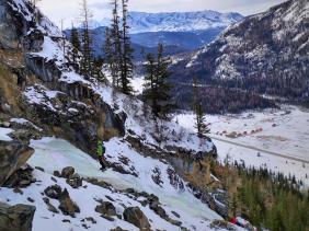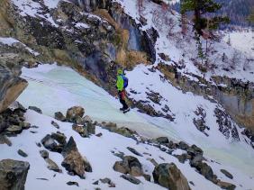 Физически подготовленные ледолазы продолжают восхождение. Полное прохождение ледопада занимает около 2 часов. Спуститься можно по тропинке слева от водопада.
