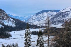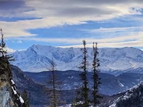 После первого подъема ледолазы выходят на широкую полочку, на которой может разместиться несколько компаний. Здесь некоторые и останавливаются. Загорают на солнце, перекусывают. От полочки открывается красивый вид на Север-Чуйский хребет, и на Акташ.