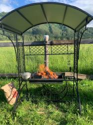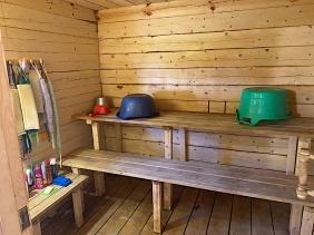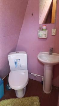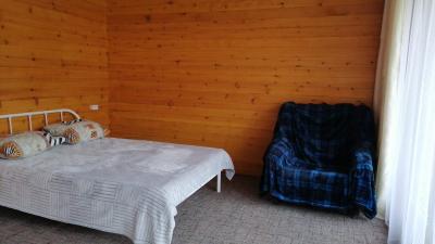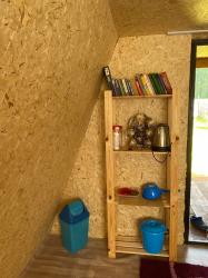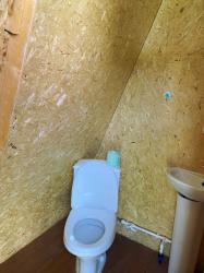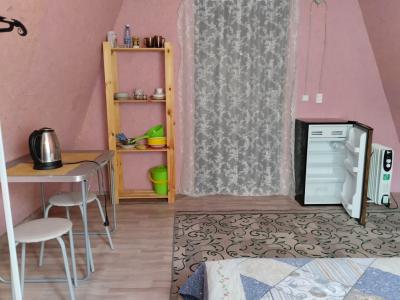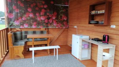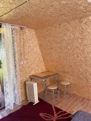 Первый этаж домика: 2-спальная кровать, столик, табуретки, холодильник, чайник. Так же на этаже - туалет с раковиной, душ.