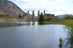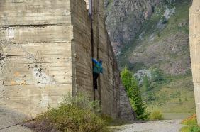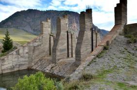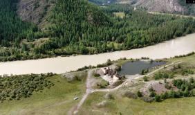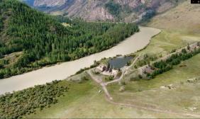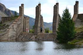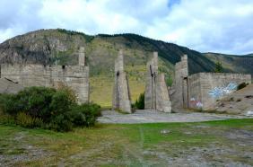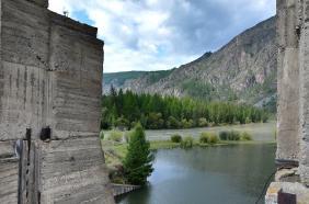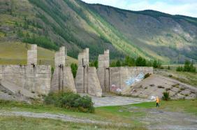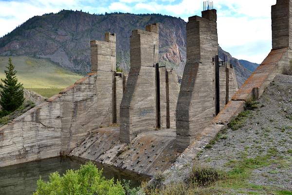 Вы увидите высокие бетонные опоры ГЭС и забетонированную площадку перед опорами. После опор - забетонированный водослив. Небольшое озеро после водослива подпитывается водой Чуи.