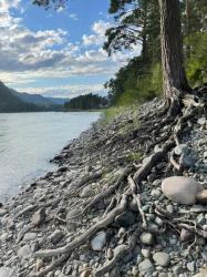 Вдоль противоположного берега простираются высокие горы, что можно назвать «пограничной стеной», ведь, попав на тот берег, вы окажетесь уже в другом районе Алтая.