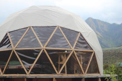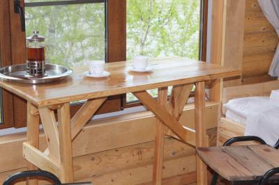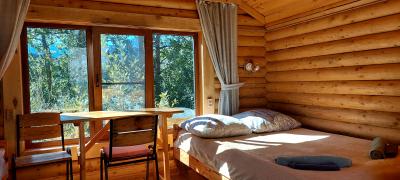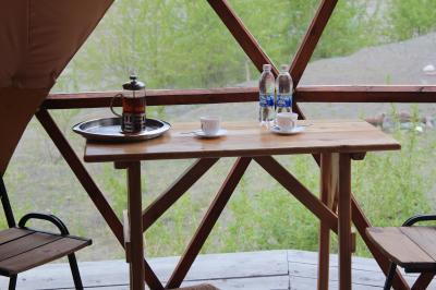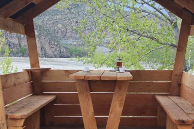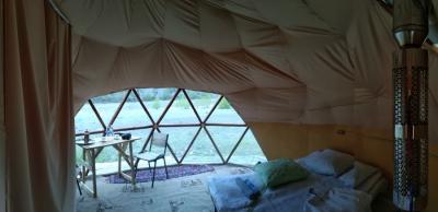 туалет, умывальник, столик, стулья, печь, возможность установки дополнительного спального места. Рядом с куполом есть беседка с видом на реку, костровая зона. По желанию подается чайник с чаем, необходимая посуда.