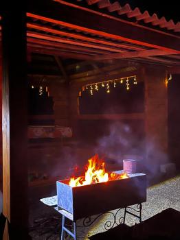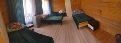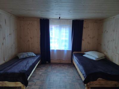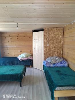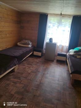 В домике: 2-х спальная и односпальная кровати, стол, стулья, холодильник, микроволновка, чайник, печка.