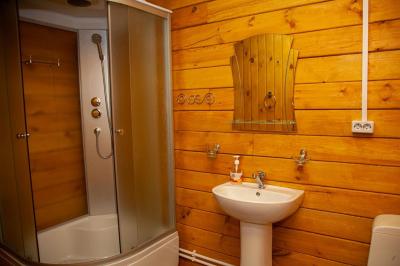 Сан. узел: душевая кабина и туалет, фен, тапочки, зубные наборы, шампунь, гель для душа.