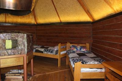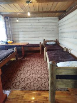 В аиле: четыре 1-спальных кровати, стол, табуретки, раковина с горячей водой,