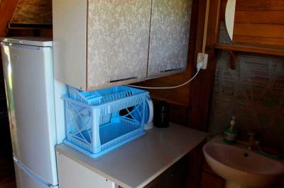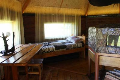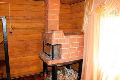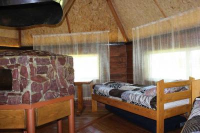 двуспальная кровати, дополнительное место, зона кухни (холодильник, посуда, раковина с горячей и холодной водой, газовая плита 2-х комфорочная, печь-камин