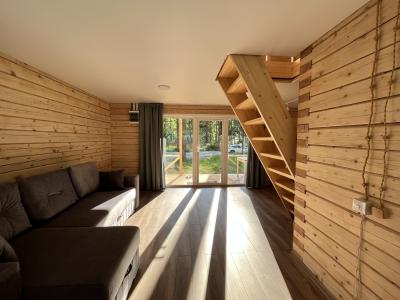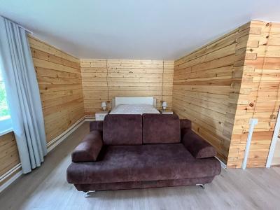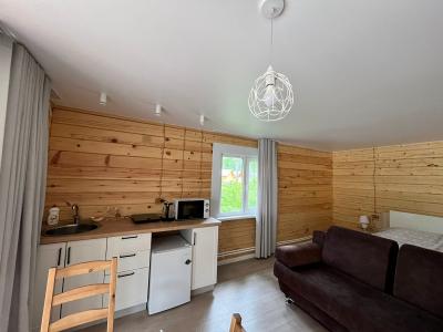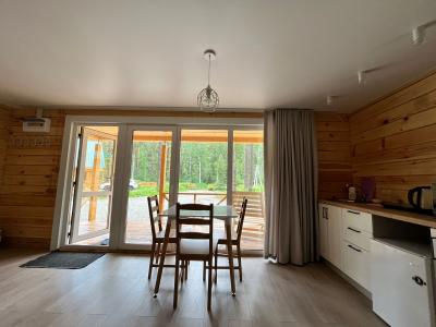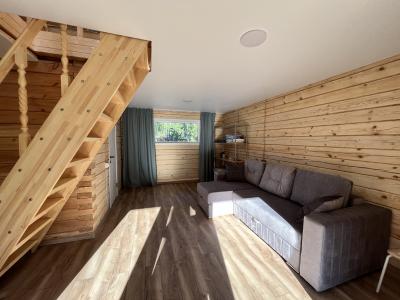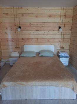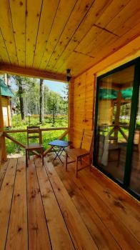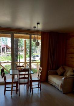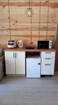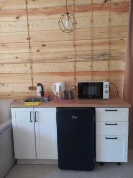 В каждом домике имеется однокомнатный номер: кухня, санузел, душевая кабина, удобная двухспальная кровать, диван, теплый пол, уютная терраса.