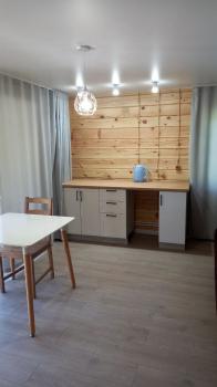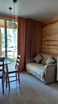 Студия первый этаж: панорамные окна, кухня, санузел, душевая кабина, раскладной диван, теплый пол, уютная терраса.
