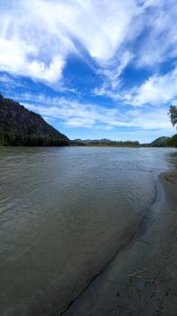 на берегу реки Катунь 70 м от берега, песчаный пляж.