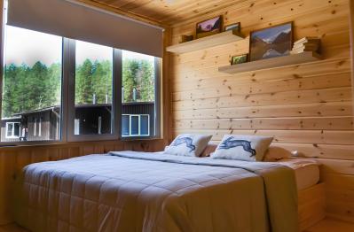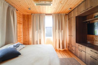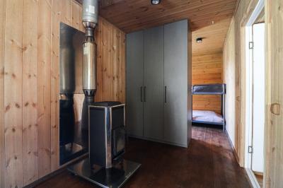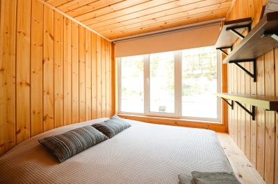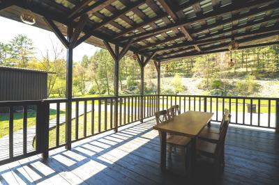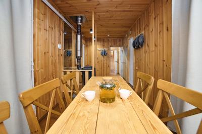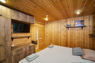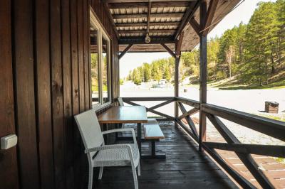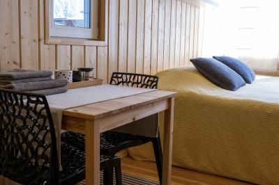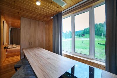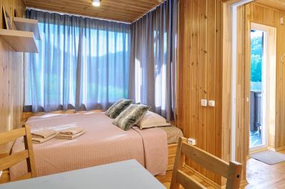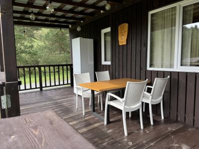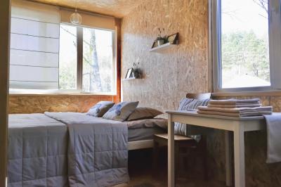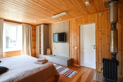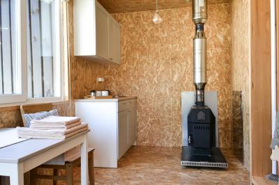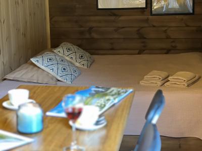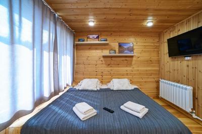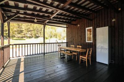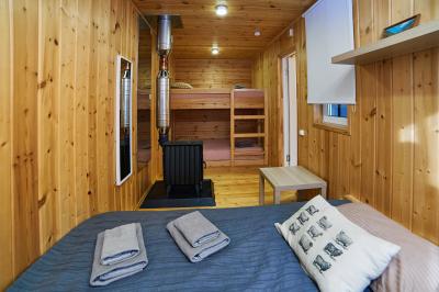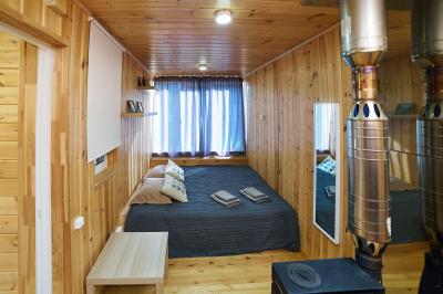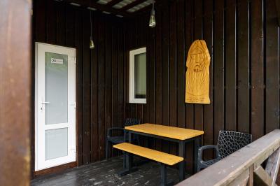 Четырехместный номер с современным интерьером, с отдельным входом и собственной крытой террасой, с дровяной печью (можно затопить за отдельную плату).
