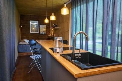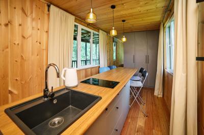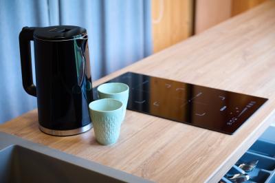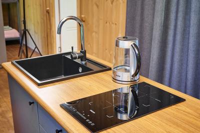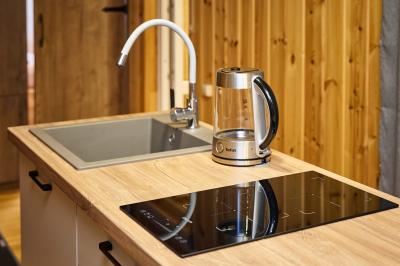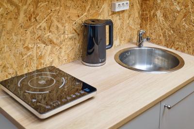 - Холодильник, индукционная плита, раковина, электрический чайник, набор посуды и чайные принадлежности