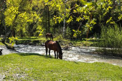 База находится в красивой долине, где нет заборов. У нас действительно нет заборов и это огромный плюс, как отмечают наши гости. Чувствуешь себя совершенно расслабленным. Часто в гости заглядывают мустанги, козочки, суслики, а в реке водится рыба. Также на территории базы есть природный родник с идеально чистой и вкусной водой.