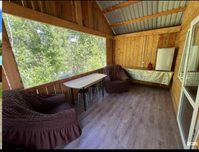 Домик 3-местный с видом на реку. Две полутораспальные кровати, холодильник, чайник, стол, плитка электрическая. Терраса с видом на реку. Санузел: туалет, раковина. Горячий душ на территории. Аренда дома