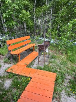 5 односпальных и 1 двухспальная кровати, холодильник, чайник, стол стулья, мангал, костровище, закрытая веранда с видом на реку Большой Яломан. Санузел: туалет, раковина. Горячий душ на территории.