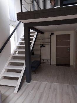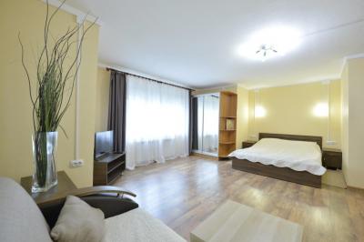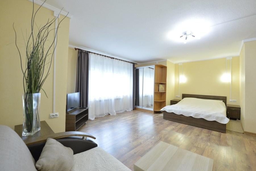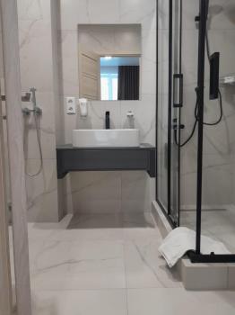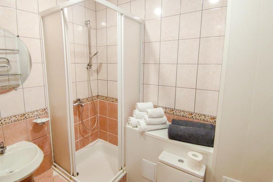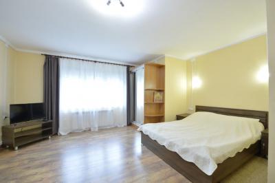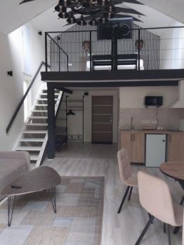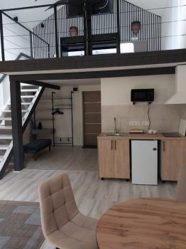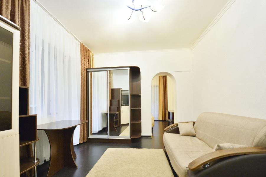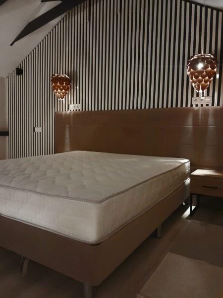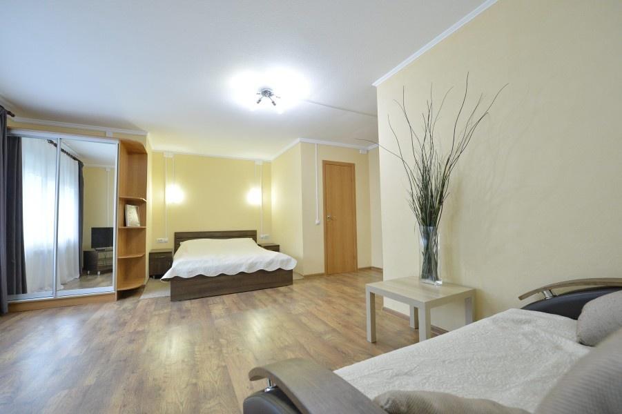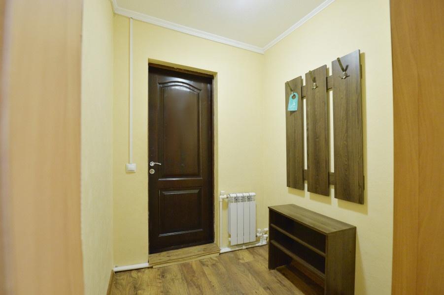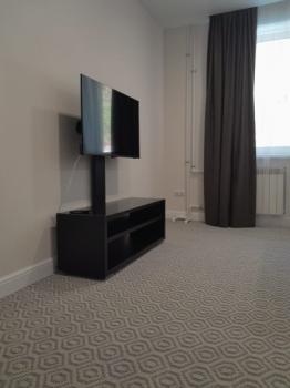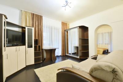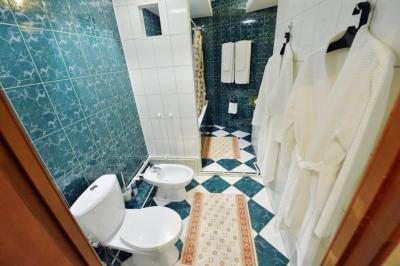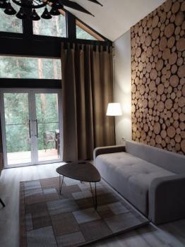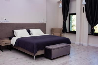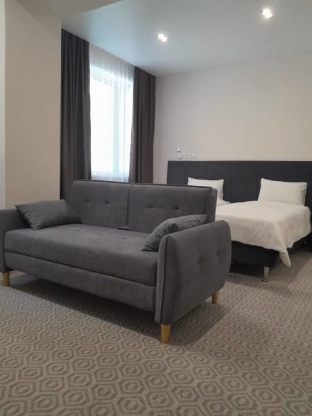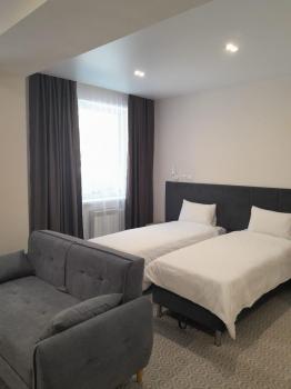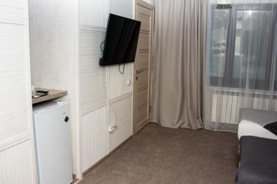 Большой однокомнатный номер в корпусе №1, вход с внешней стороны корпуса . Двуспальная кровать, мягкая мебель (раскладной диван), платяной шкаф, тумбочки, журнальный стол, ТВ, холодильник. Туалетная комната: WC, раковина, душ. 2 осн.места + 2 доп.места (раскладной диван).