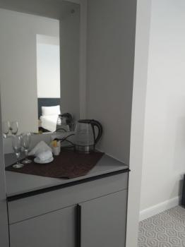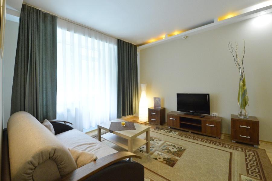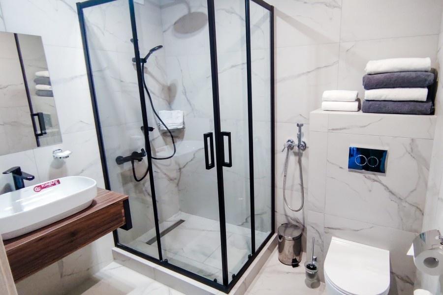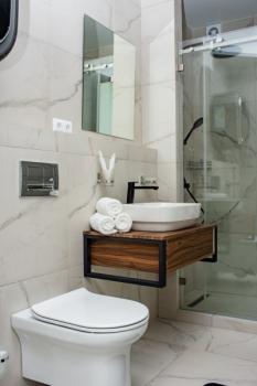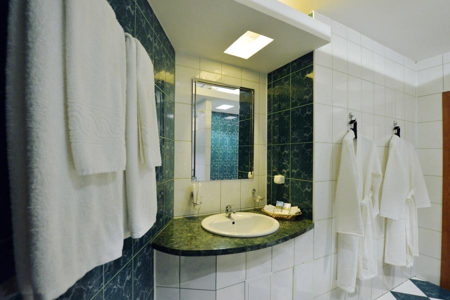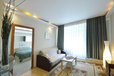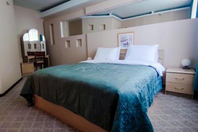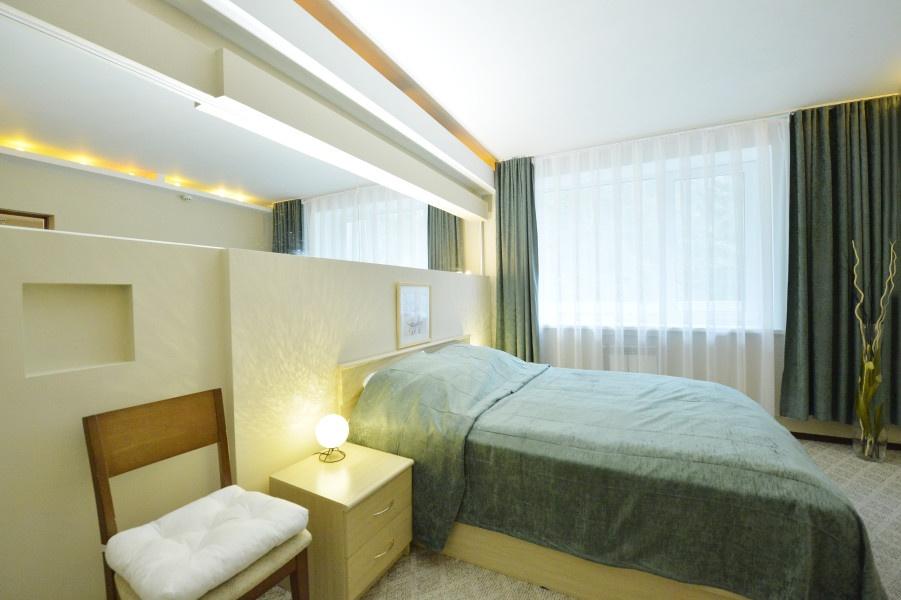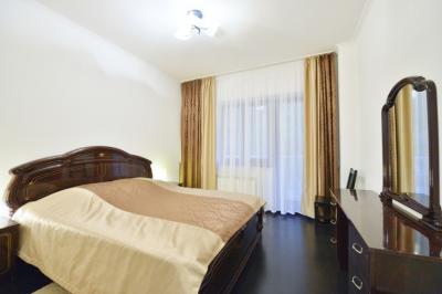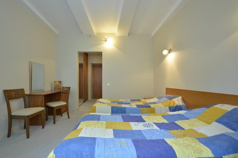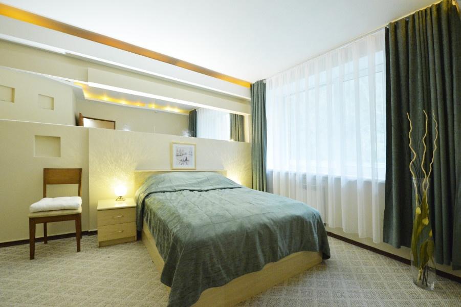 Двухкомнатный номер в корпусах №1,2, состоит из гостиной и спальни. В номере: двуспальная кровать, мягкая мебель (раскладной диван), платяной шкаф, тумбочки, холодильник, чайник, мини-бар, ТВ, DVD. Туалетная комната: WC, раковина, душ. 2 осн.места + 2 доп.места (раскладной диван).