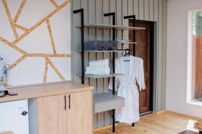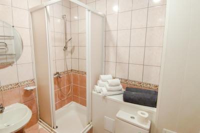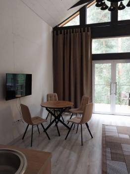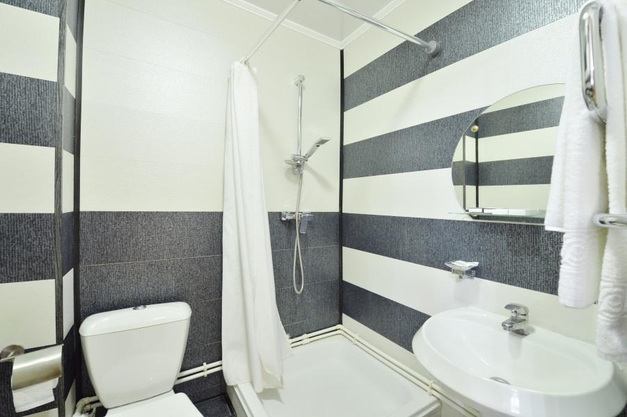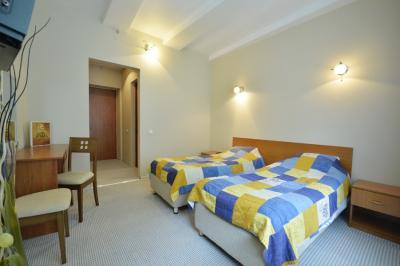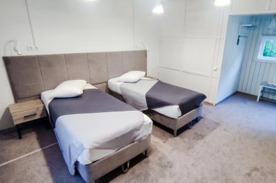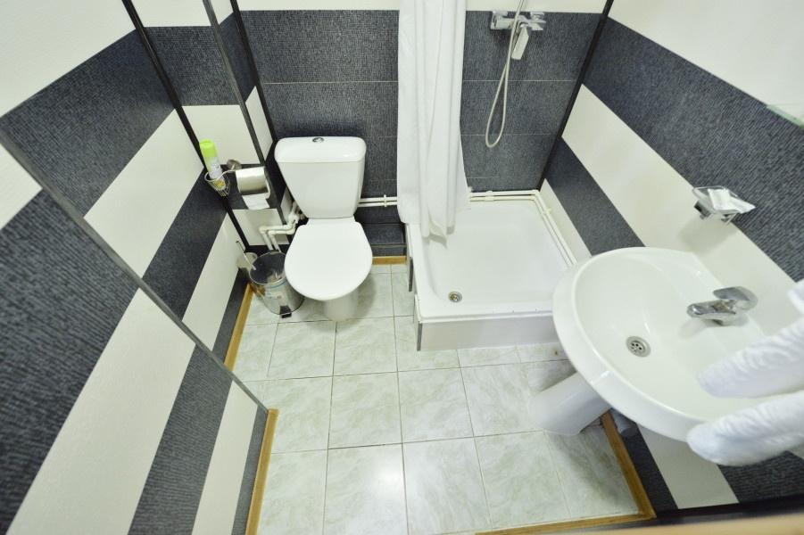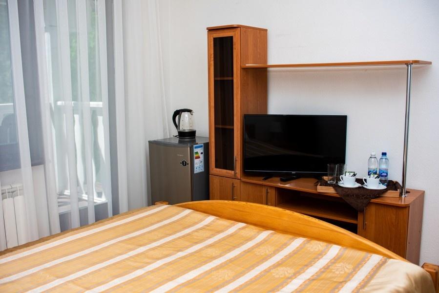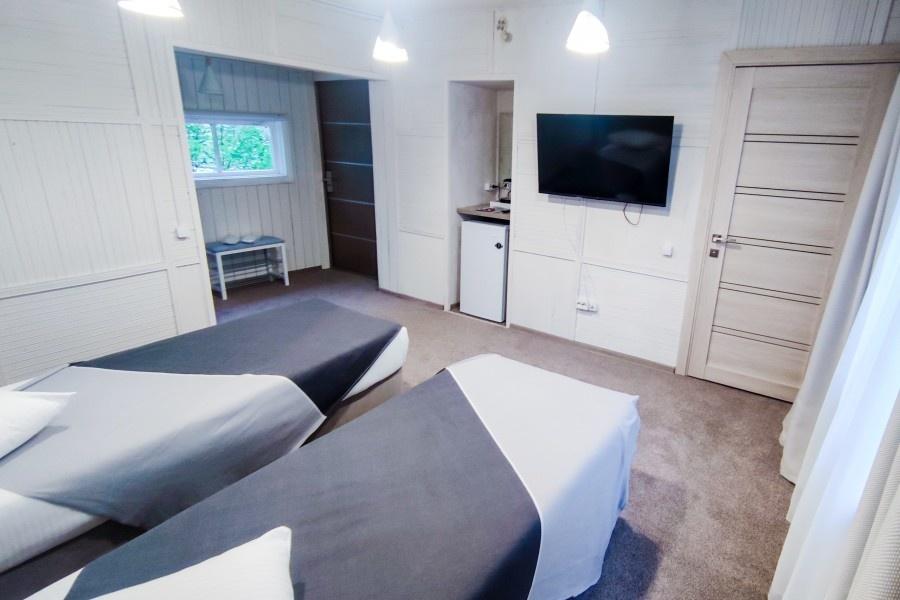 Однокомнатный номер в корпусе №1 и в №3. Двуспальная кровать (4 номера) и две односпальные (один номер), шкаф, тумбочки, ТВ. Туалетная комната: WC, раковина, душ. 2 осн.места + 1 доп.место (диван/ раскладная кровать).