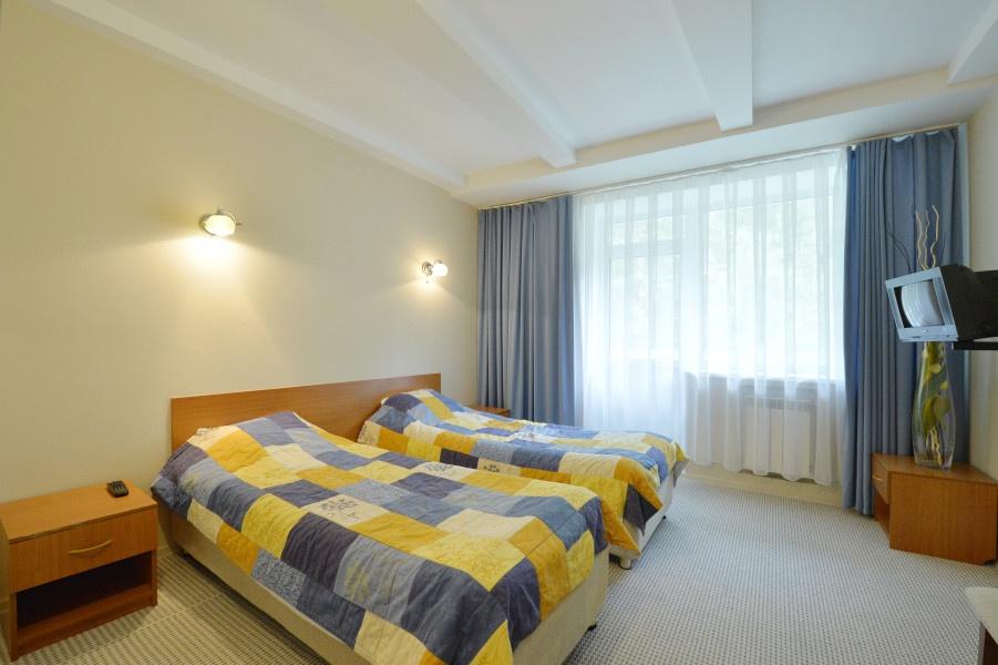 Однокомнатный номер в корпусе №3 с балконами. В номере: две односпальные кровати с возможностью совмещенного использования, платяной шкаф, тумбочки, стол, ТВ. Туалетная комната: WC, раковина, душ. 2 осн. места + 1 доп. место (раскладная кровать).