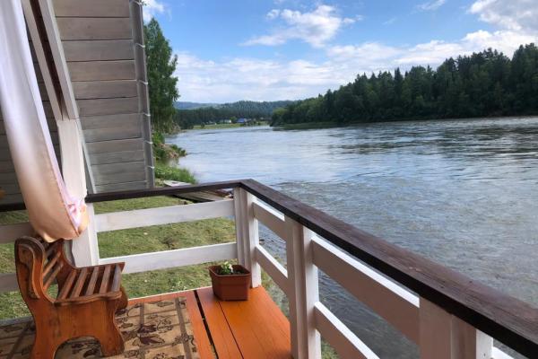 три благоустроенных домика, банька на берегу реки Бия, беседка со смотровой площадкой.