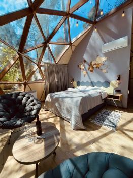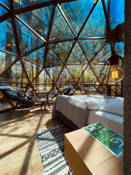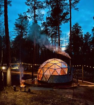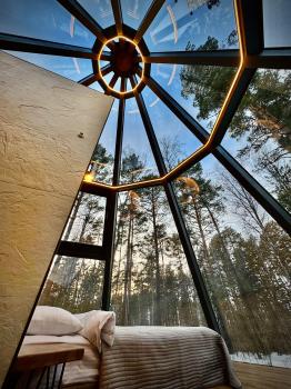 SFERA 360 — настоящий дом из стекла и дерева, потолок с панорамной крышей. Тёплые полы по всему дому и стильная печь, создадут комфортное времяпровождение даже в самые сильные морозы, а мощный кондиционер приятную прохладу в жаркие дни. Продуманная система штор, позволит при необходимости, уединиться от окружающего мира. До 4 чел. (2 Осн.+2 доп. места)