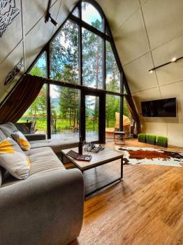 PRISMA CHALET - уникальный дом в стиле A-FRAME с закругленными вершинами. Дизайнерский ремонт в стиле модерн, подчеркивает изящные изгибы шале, мебель и материалы подобраны с особым вниманием, для создания максимального релакса и удовольствия от времяпровождения.