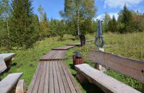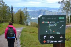 На верхней станции кресельного подъемника Восход, налюбовавшись видами на горы и скульптуру Богатырь Когудей Мерген, вам надо спуститься по указателю Поляна Топшур. Так же по Тропе Легенд можно пройти, если вы поднялись на подъемнике Ледник, а затем на Софие.