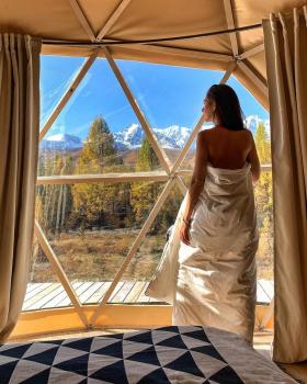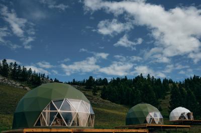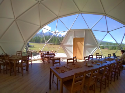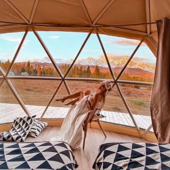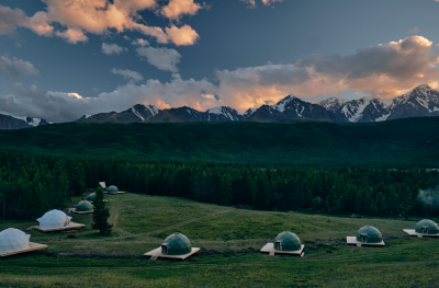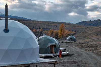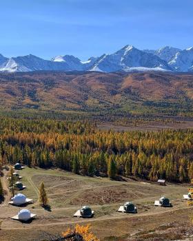 10 купольных домов, 5 комфортных лесных шатров и 8 экспедиционных шатров расположены на живописной поляне в Курайской степи в сердце Геопарка Алтай.