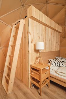 Интерьер купольных домов разработан одним из лучших дизайнеров Сибири. В каждом номере два основных места и два дополнительных места наверху модуля из алтайской лиственницы. Внутри модуля — умывальник с водой из горной реки и биотуалет.