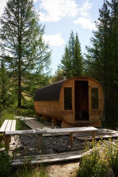 А на берегу реки Актру стоит кедровая баня-бочка с панорамным видом на горные вершины. Из жаркой парной можно забежать в ледниковую реку, а после бани хорошо насладиться травяным чаем и алтайским мёдом.