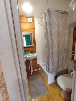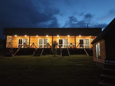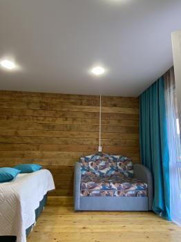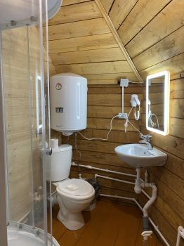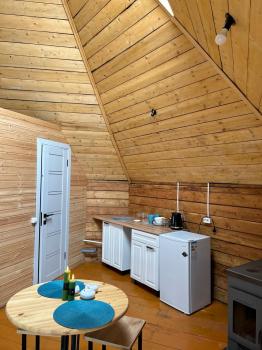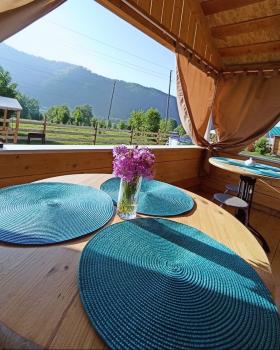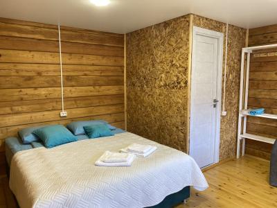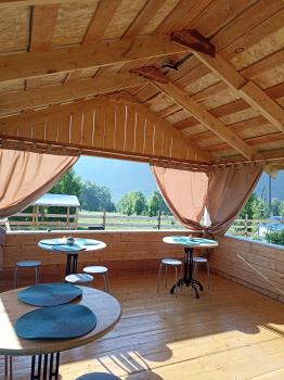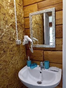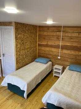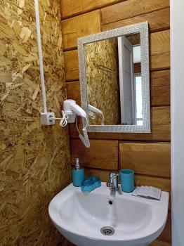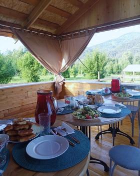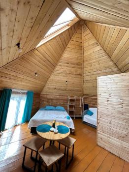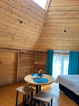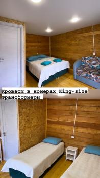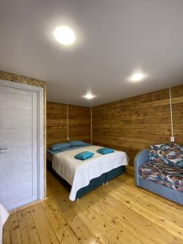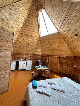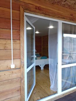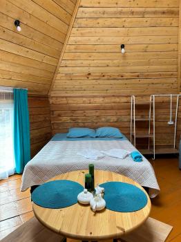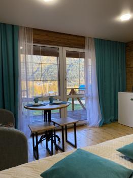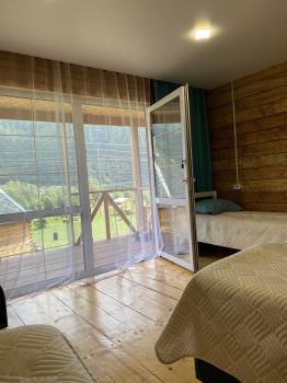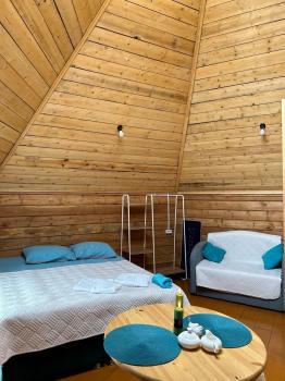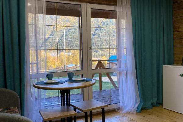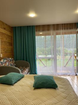Номера с панорамными окнами с видом на горы и реку. В каждом номере двухспальная кровать 160*200 (кровать-твин трансформируется в односпальные), диван 130*200, санузел с душем, постельное белье, белые полотенца, тапочки, средства для гигиены, фен, холодильник, чайник. У каждого номера своя терраса со столиком и скамейкой, а так же в номера проведено отопление. 2 основных + 2 доп. места.