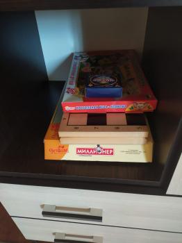 титан, стол, стулья, шкаф для одежды, фен, холодильник, обогреватель, чайник, плитка, посуда, кастрюля, сковорода, постельные принадлежности, по 2 полотенца на каждого, настольные игры.